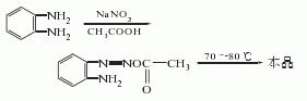 1.由鄰苯三胺與亞硝酸鈉反應而得。將鄰苯二胺加入50℃水中溶解,再加入冰醋酸,降溫至5℃,加入亞硝酸鈉攪拌反應。反應物漸漸變成暗綠色,溫度升至70-80℃,溶液變為桔紅色,于室溫放置2h,冷卻,濾出結晶,用冰水洗滌,干燥得粗品,將粗品減壓蒸餾,收集201-204℃(2.0kpa)的餾分,再用苯重結晶,可得熔點為96-97℃的產品,產率80%左右。曾有報道用亞硝酸鈉處理多菌靈的縮合廢水而得副產物苯并三氮唑。